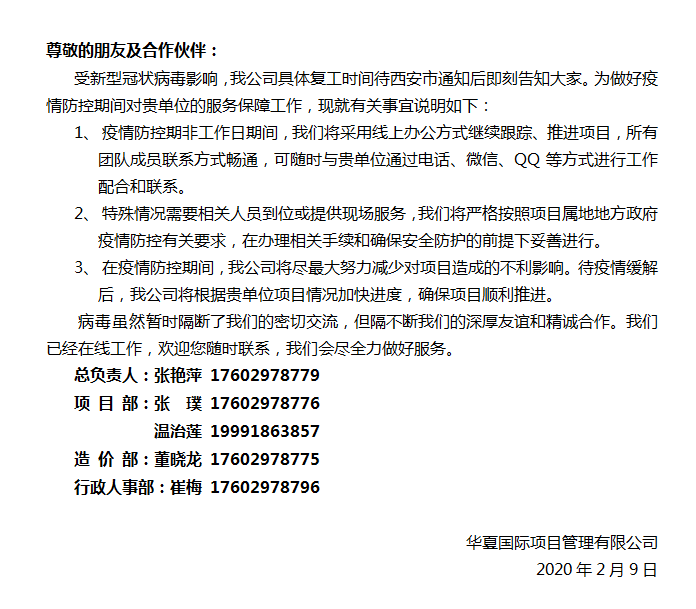 華夏國際項目管理有限公司已開始全員線上辦公,歡迎大家隨時聯(lián)系